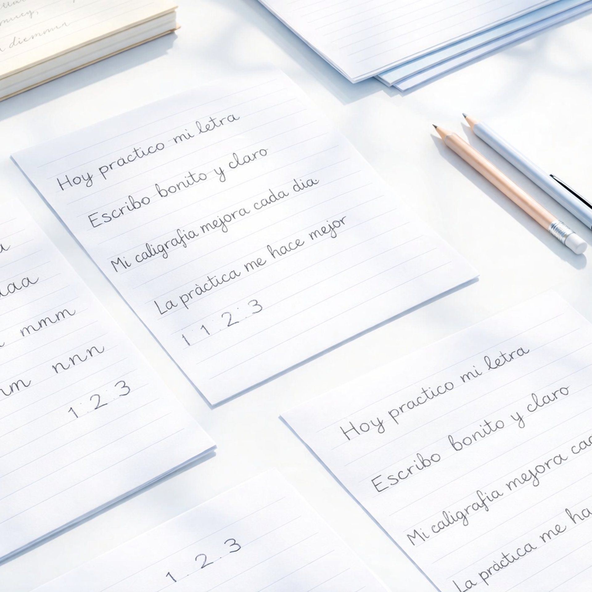 Vas a recibir un método guiado con los conceptos sobre cómo practicar y mejorar tu letra o la de tu hijo/alumno. Incluye cuadernos de ejercicios listos para imprimir y usar, letra por letra y número por número. Además, tendrás una lista con 20 frases para practicar de forma completa y ver cómo tu escritura va mejorando. Imprime y úsalo cuantas veces quieras.